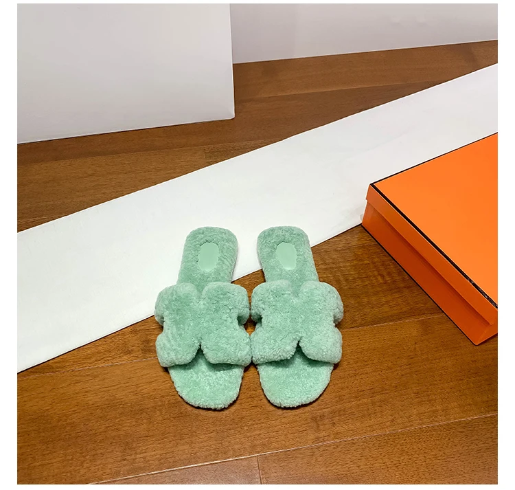 XZ006 Designer Custom Logo Luxury Orange H Slipper for Women Girl Plush House Shoes with Open Toe Home Party Wear Wool Slippers